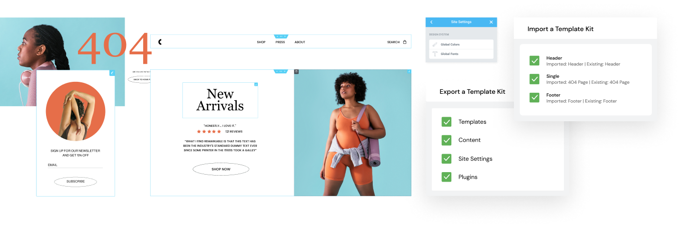 Export your best designs as full website kits, including settings, content and templates, and instantly import them into any new projects. You will save setup time and get to focus solely on creation.