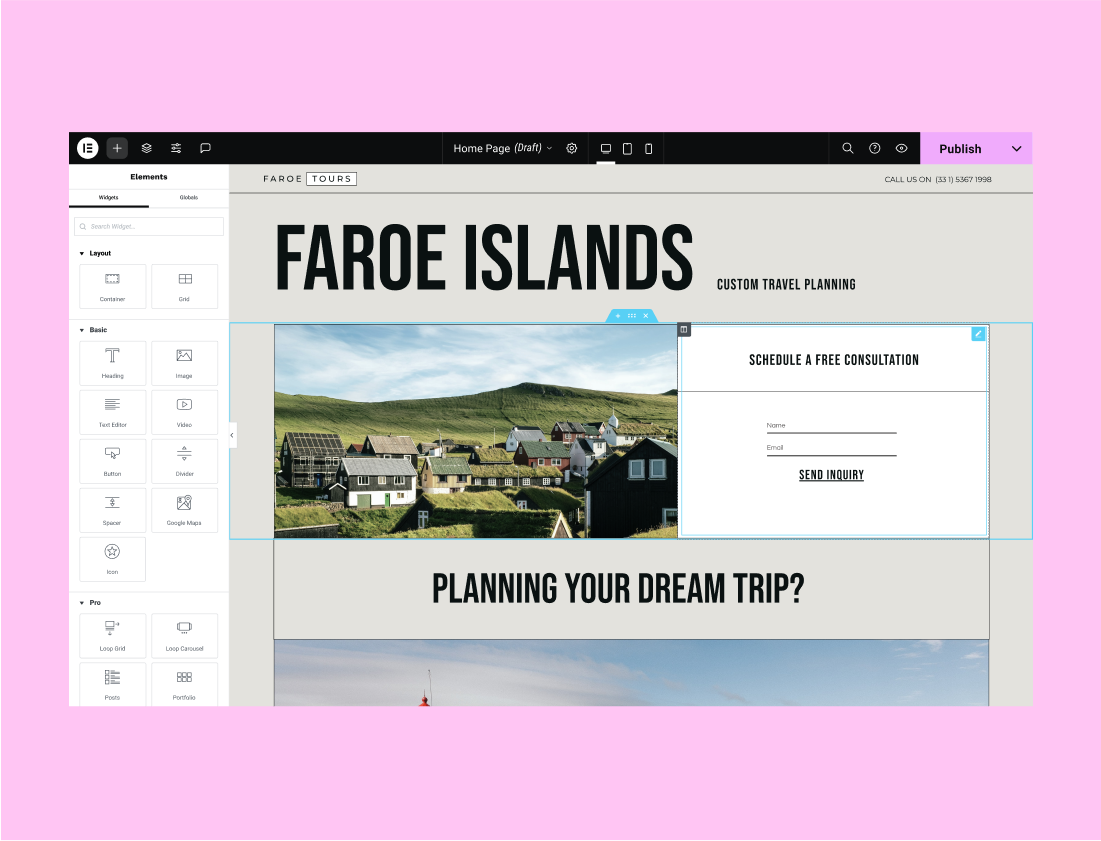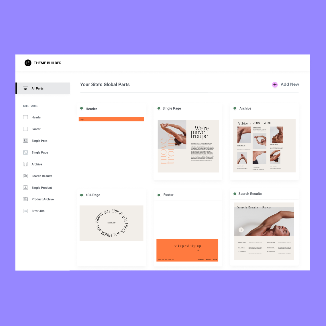 Design your entire website from one place, including the header, footer, and content. Set global fonts, colors, and widgets to reuse them anywhere on your website.