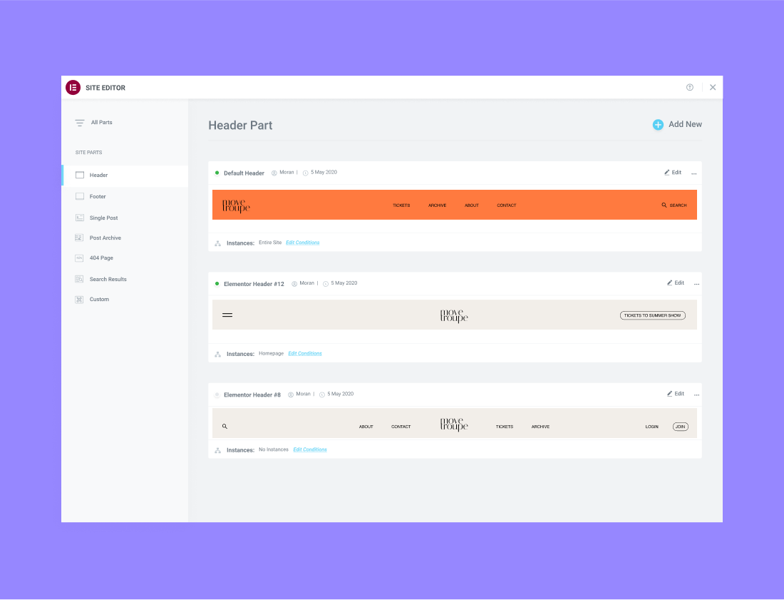 Review and edit each component of your website individually, from Headers & Footers to Post, product pages, and more.
