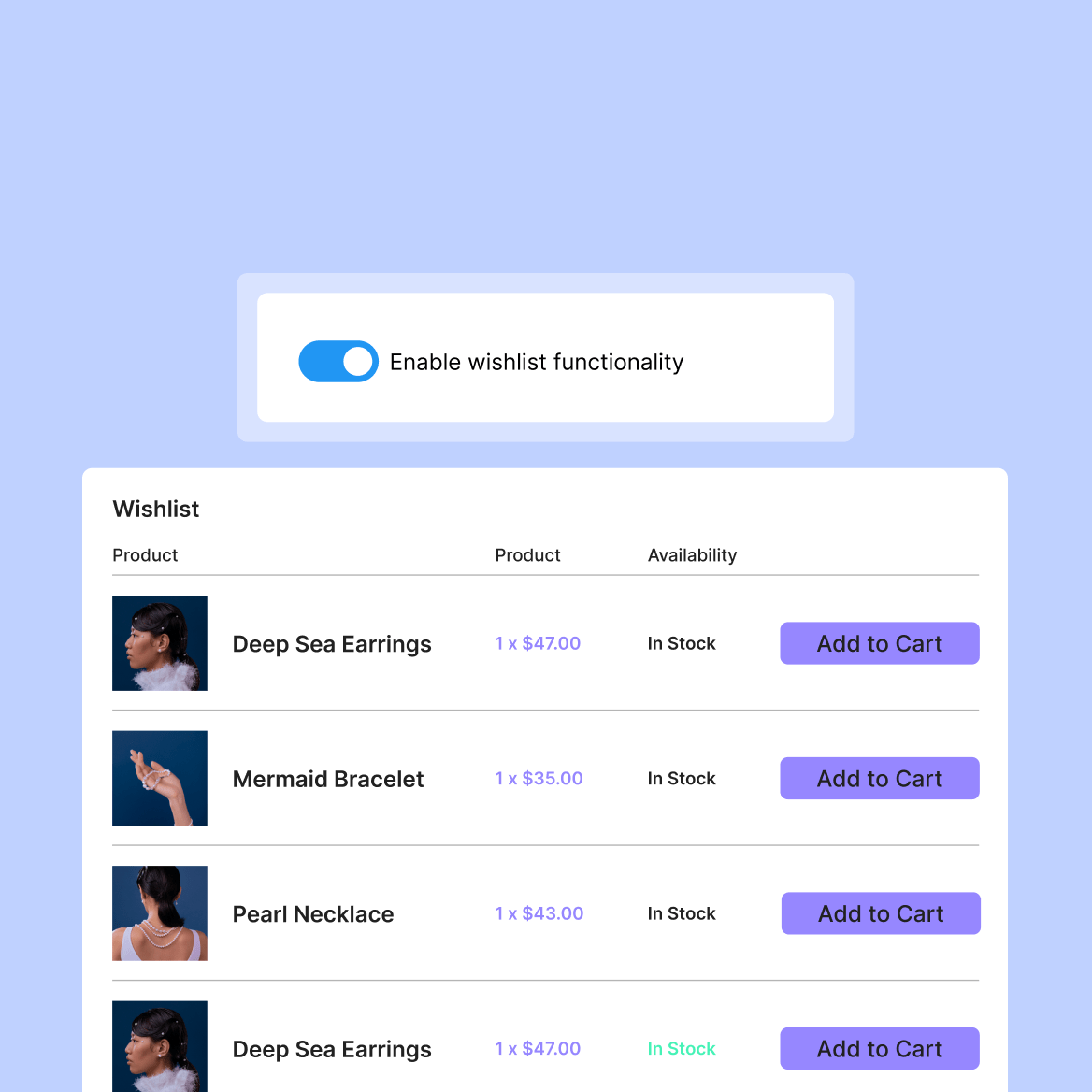 | Wishlist functionalityLet your users get to the purchase point quicker and more often with wishlists. | ||