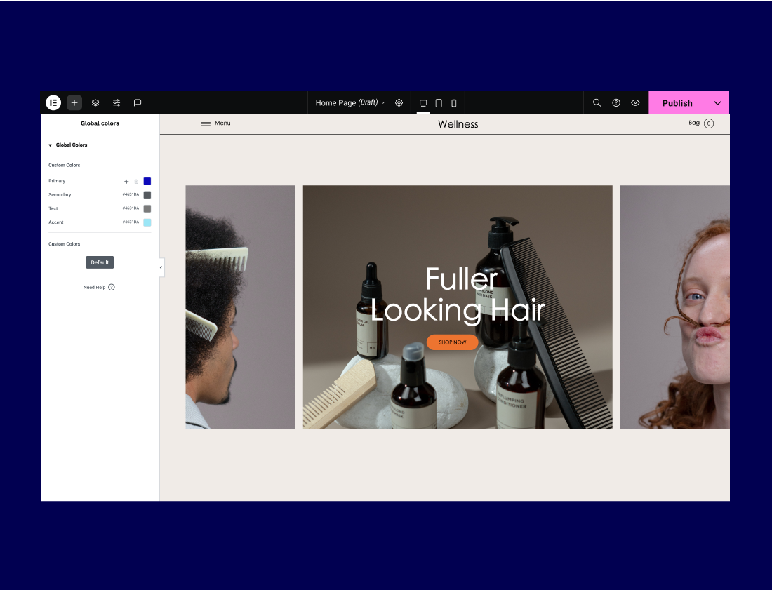 Design your entire website from one place, including the header, footer, and content. Set global fonts, colors, and widgets to reuse them anywhere on your website.