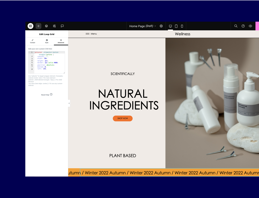 Add custom CSS to any section, column, widget or page in Elementor.
